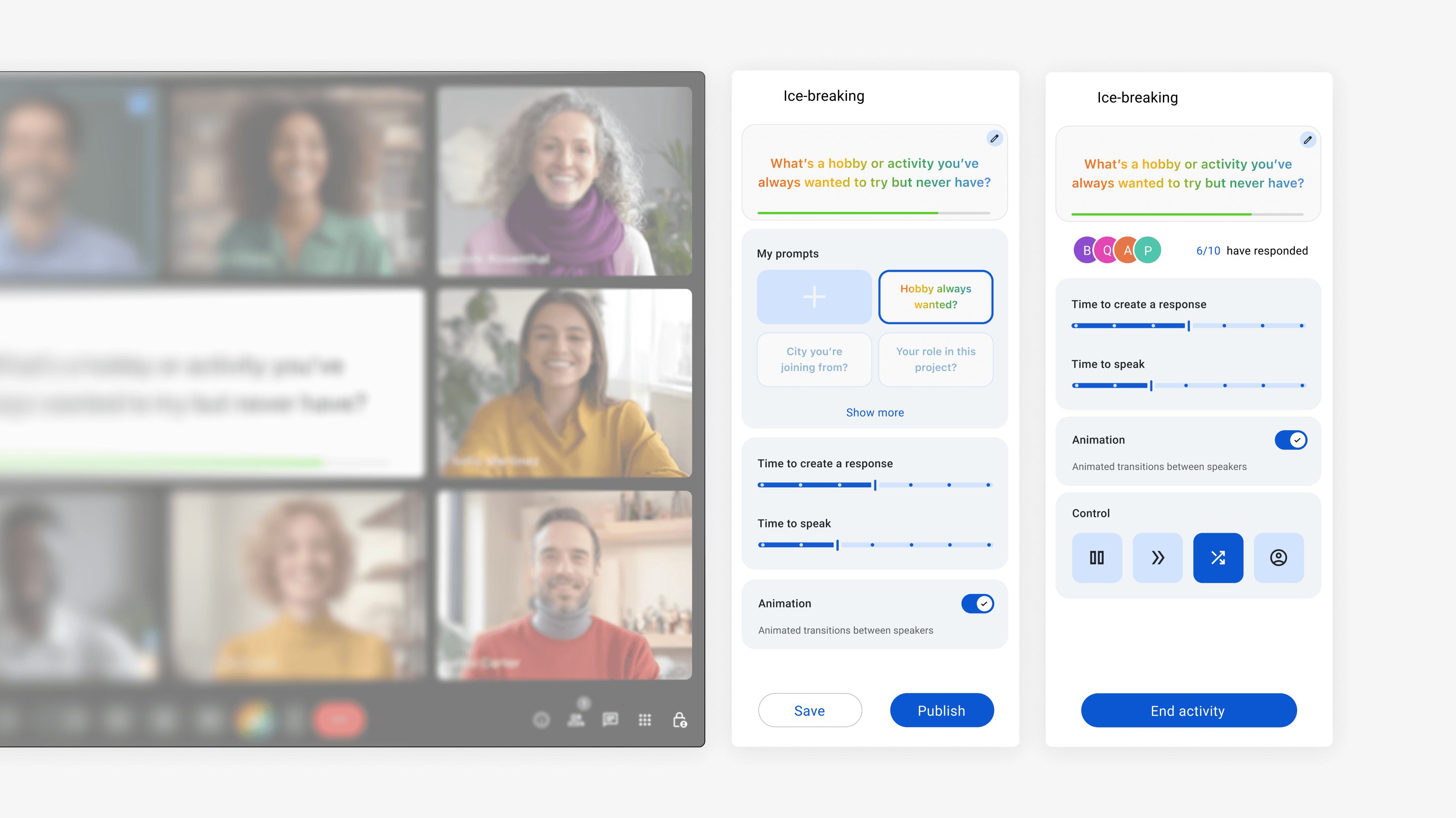 Facilitators configure timing and order in advance, and can manually adjust anything during the session as needed.